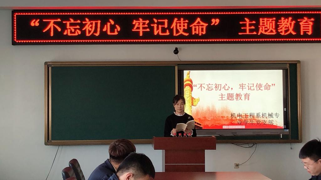 学生党支部书记王虹带领大家学习了习近平在“不忘初心牢记使命”主题教育工作会议上的讲话;全省“不忘初心牢记使命”主题教育第一批总结暨第二批部署会议精神传达提纲;省委书记张庆伟在“不忘初心牢记使命”主题教育会上的讲话;市委书记孙砷在全市“不忘初心牢记使命”主题教育工作会议上的讲话;省委第一巡回指导组组长郭长义在市委“不忘初心牢记使命”主题教育动员部署会上的讲话!老师还让几位学生分别以演讲的方式来表达自己对“不忘初心,牢记使命”的理解与看法,向新生们强调了开展“不忘初心、牢记使命”主题教育活动重要性。