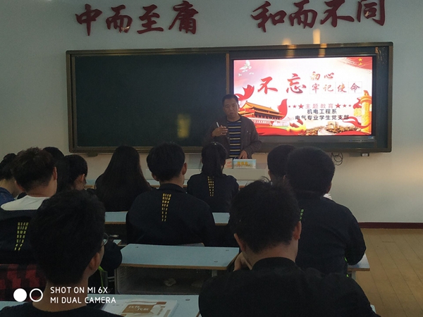 王连俊老师讲了“不忘初心,牢记使命”的内涵,要求学生牢牢抓住深入学习贯穿习近平新时代中国特色社会主义思想这一主线,用党的创新理论武装头脑,推动全党更加自觉地为实现新时代党的历史使命不懈奋斗,各班党员、积极分子认真记着笔记。