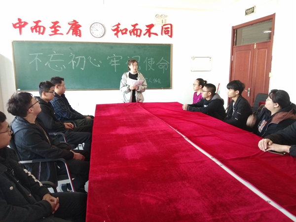 会上,王虹老师先是向大家阐述了“东北抗联精神”、“北大荒精神”、“大庆精神”、“铁人精神”这龙江四大精神,报告了自己的学习体会,明确了今后目标与初心使命,在未来要用更加积极的心态去做好工作,提升自我,带动所有人用积极的心态迎接今后的挑战。每个时代都有每个时代人的使命与当担,在学习了《习近平关于“不忘初心牢记使命”论述编摘》部分章节后,大家明确了身为一名党员应尽的义务和责任,了解了党奋斗的艰苦历程。王虹老师希望所有人能牢记自己的职责,不忘初心学习先辈刻苦奋斗,认真负责的完成每一项工作,脚踏实地,真诚做人。之后每个同学都纷纷发表了对于学习“不忘初心,牢记使命”的学体会和感悟,并表示要永远保持自己的积极性性,坚守初心,不忘使命。