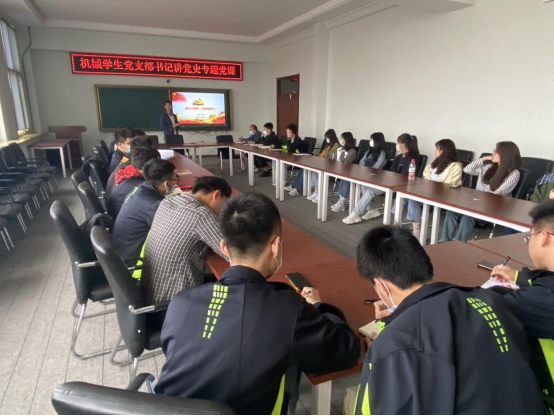 强化党史教育是增强党性修养、筑牢宗旨意识的有效途径。为了深入贯彻落实“学党史、忆校史、说成长史”的要求,高标准高质量组织开展好党史学习教育。机械学生党支部于2021年4月21日在图书馆608会议室组织开展“书记讲党史专题党课”集中学习活动。机械学生党支部书记李运强为机械专业全体党员、积极分子进行了一次深刻的党史专题讲座。参加学习的人员有:全体党员和入党积极分子。