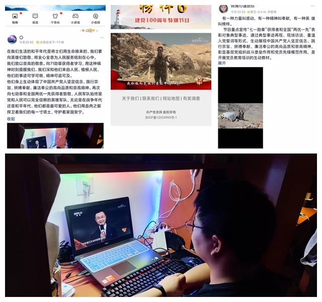 在观后感中,党总支书记甄彩霞说:正是这些英雄的光辉形象,弘扬了不怕苦、不怕死的爱国主义和革命英雄主义精神。我们作为新时代教师,要向英雄学习,在英雄守护的和平中,在自己的岗位上做出相应的贡献”。电气教师党支部书记刘微同志说:“在我党百年的历史长河中,无数共产党员不断奉献自己的力量,作为一名大学教师,我要立足本职岗位,不断创新,积极进行教学改革,为祖国培养一批批合格的人才。机械学生党支部书记李运强说:本次节目的观看有助于引导广共产党员不断提高政治觉悟和政治能力,把对党忠诚、为党分忧、为党尽职、为民造福作为根本政治担当,永葆共产党人政治本色;有助于引导广大共产党员坚持实事求是、把握政治原则,使思想和行动更加符合客观规律、符合时代要求。学生预备党员陈东旭表示:我们向71勋章获得者致以崇高的敬意,他们身上生动体现了中国共产党人坚定信念,践行宗旨,拼搏奉献,廉洁奉公的高尚品质和崇高精神。无论是在战争年代还是和平年代,他们都是最可爱的人。