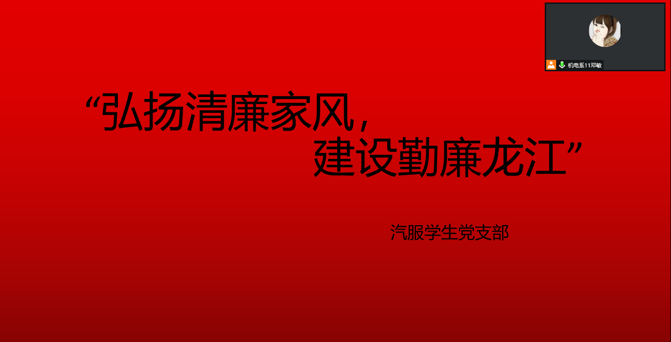 2022年12月22日,汽车服务工程学生党支部组织开展“弘扬清廉家风,建设青年龙江”活动。汽车服务工程专业学生党支部书记邓敏主持,全体党支部党员参加。