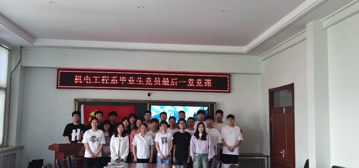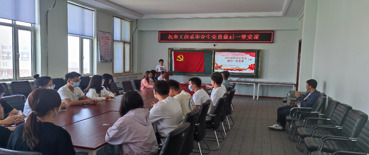 2023年6月2日上午在图书馆608会议室,机电工程系党总支为2023届毕业生党员进行了最后一堂党课。机电工程系党总支书记王丽萍老师、机械学生党支部书记李运强老师以及全体毕业生党员参加,本次党课由吕嵩岩老师主持。