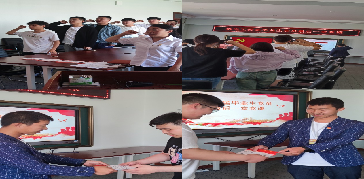 接下来由机电工程系党总支书记王丽萍老师为2023届毕业生党员进行了最后一堂党课教育,王书记从坚定理想信念、加强党史学习、学习转化为实际行动、学会感恩等方面讲授,重点强调“守纪律、守规律、做表率”。现在不需要我们抛头颅,洒热血,但也要事事做榜样。全体党员纷纷表示要在今后的工作中牢记入党初心,做到对党忠诚,永葆初心不变。党员代表宋恩超和徐海峰也分享了在党组织的成长、感悟、感谢和今后的努力方向。由王书记为毕业生发放纪念品,期待各位毕业生党员“不忘初心,牢记使命”“前程似锦,砥砺前行”。
