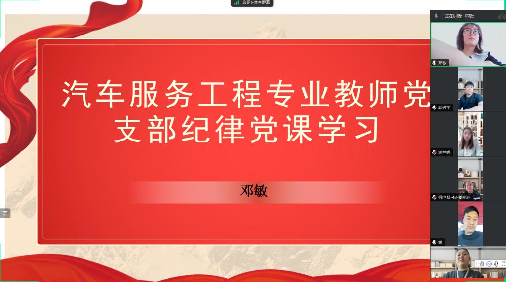 为深入学习贯彻习近平总书记关于党纪学习教育的重要讲话和重要指示精神,落实《通知》要求,加强党员纪律意识,提高政治觉悟,深刻领悟“两个确立”的决定性意义,增强“四个意识”、坚定“四个自信”、做到“两个维护”,汽服专业教师党支部于5月20日通过腾讯会议的形式,开展党纪教学学习专题党课,由支部书记邓敏主持,全体党员参加。