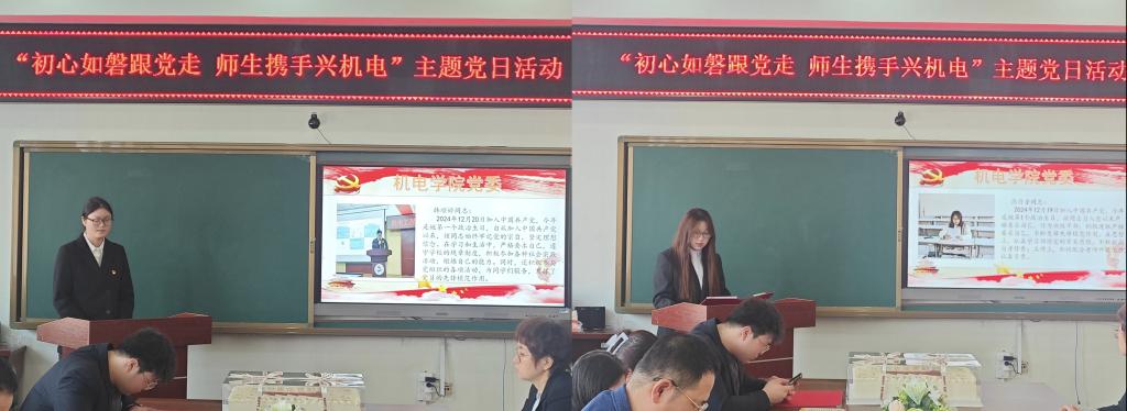 为进一步厚植党员党性根基,强化党员身份意识和党性修养,政治身份认同感,进一步凝聚奋进新时代的磅礴力量,不断激励党员干部不忘初心、牢记使命的责任感和使命感。12月18日,机电学院党委在图书馆608举办“初心如磐跟党走 师生携手兴机电”主题党日活动。活动由机电学院学生党员韩宗畅主持,机电学院全体党员参加。