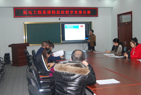 为贯彻《中共中央国务院关于加强和改进新形势下高校思想政治工作的意见》文件精神,落实立德树人根本任务,深入挖掘课程德育内涵,推动教师承担起“课程思政”主体责任,12月16日机电系在图书馆608由教学副主任黄颖主持开展了课程思政教学决赛。机电系主任高爱利、副主任黄颖、孙晓芳、团总支书记王虹担任评委。