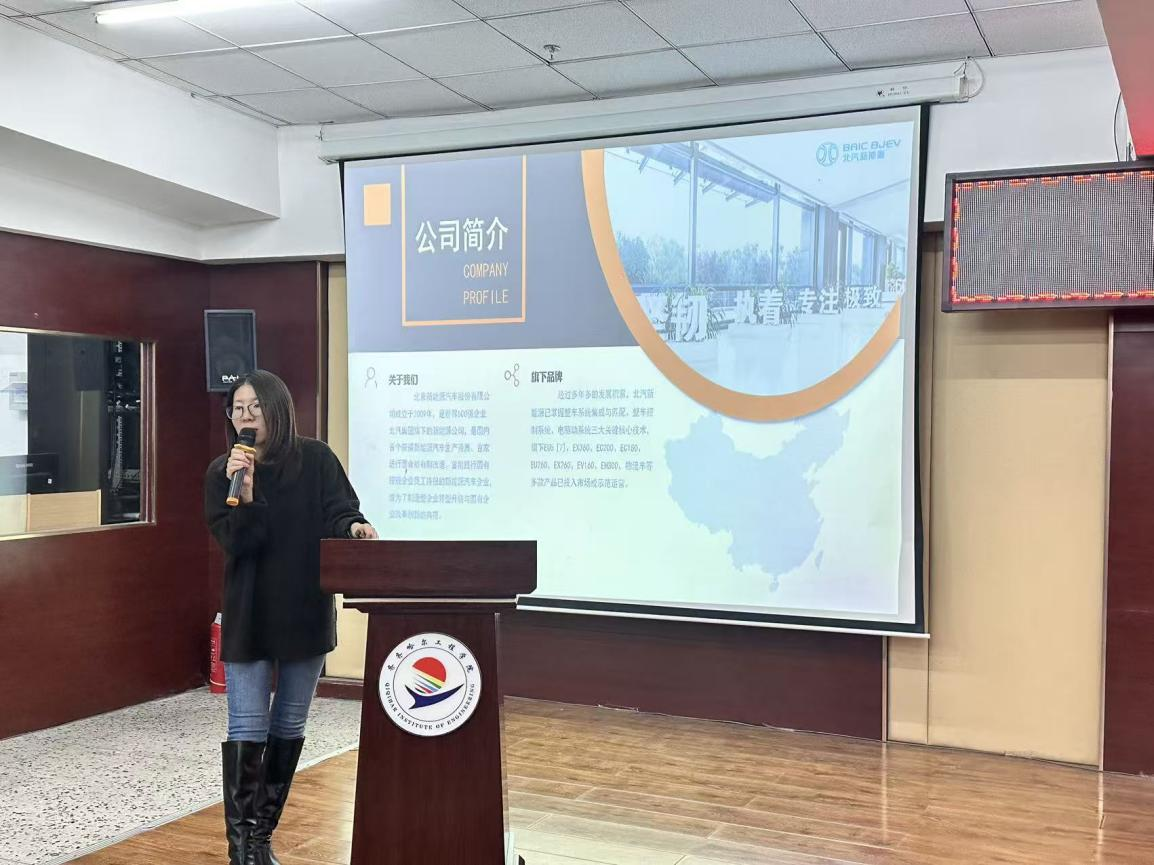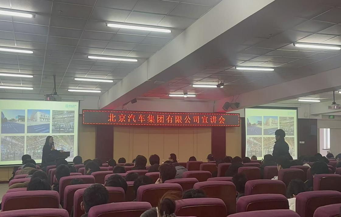 本次宣讲会由北汽集团人力资源部牵头,联合研发、生产、市场等核心业务板块组成宣讲团队。活动伊始,主持人详细介绍了北汽集团的发展历程、业务布局及行业地位,通过短片展示了企业在新能源汽车研发、智能化技术应用等领域的核心成果,让在场学生直观感受企业实力。