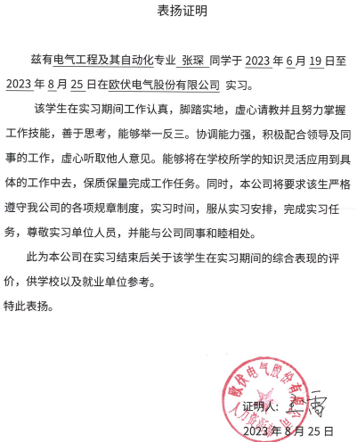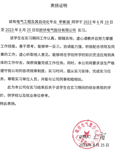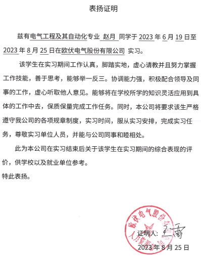 近日,电气专业收到欧服电气股份有限公司实习单位送来的多封表扬信,电气221王欣欣、张琛,电气222李紫涵、赵月,223梁文茜、张春鹏、韩忠畅,实习期间表现优秀,提出的很多建议也被实习单位采纳,得到了实习单位的表扬。