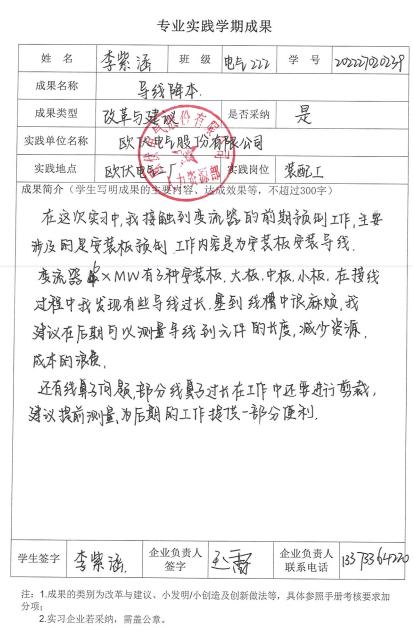其中王欣欣同学建议,由于开关柜下防雷位置比较靠下且有遮挡,建议改为组装前安装好,这样能节约组装所需的时间和人力,提高工作效率;李紫涵同学建议,在接线过程中因导线过长,导致安装线槽比较麻烦,可以在后期测量导线到元件的长度,选取合适的线长,这样可以减少成本的浪费;梁文茜同学建议,互检人有机会应参与到互检对象的工作,熟练掌握专业技能知识,防止本工位如有员工离开而带来的不便,以上合理化建议全部被企业采纳。