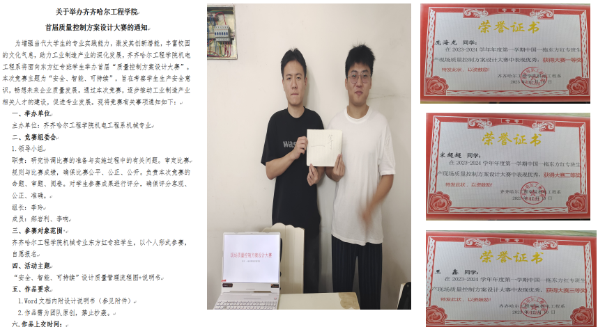 为了增强东方红专班学生的专业实践能力,激发创新意识,助力校外课堂建设,促进校企合作,12月4日,齐齐哈尔工程学院机电工程系机械专业中国一拖东方红专班开展了首届质量控制方案设计大赛。共12名同学参加,李玲、郝岩利老师作为本次比赛评委,与一拖专班同学们一起利用下班休息时间在线上组织了本次比赛。本次竞赛主题为“提升质量管理水平、促企业可持续发展”,旨在考察学生“现场质量管理”知识掌握情况。通过本次竞赛,提升机械设计制造及其自动化专业毕业生的理实结合能力,以及分析问题、解决问题的能力,实现专业技能提升、实践能力提升,从而在工作中运用现场质量管理知识,保证一拖产品质量。本次大赛评出一、二、三等奖,并颁发奖状,以资鼓励。