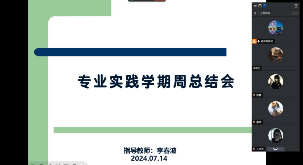为及时掌握学生专业实践学期的完成情况,提高实习质量,指导教师李春波于7月14日晚召开专业实践学期阶段性总结会,所带全体学生参加。