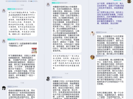组织委员姜宇同学在群内发布相关资料,由同学们自行观看并发表感悟,同学们踊跃发言,充满正能量。吴冠霖同学发言道:“榜样是看得见的力量,我们要以学习刘羲檬的美德事迹为契机,托起‘崇德向善孝亲敬老’的道德信仰。”张展飞同学发言道:“充满稚气的年龄,却托起了崇德向善的道德信仰;柔弱的小肩膀,却扛起了孝老爱亲的传统美德;‘小小的手’,却推动着‘道德大车’不断前行。”同学们发言踊跃,积极正能量。