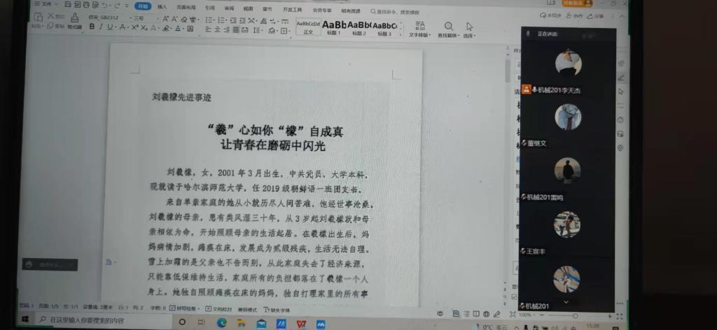此次班会由李天杰同学主持,他为同学们播放了一段视频,大家看到视频上刘羲檬的名字列入第八届全国道德模范入围候选名单中时,脑海中浮现出一个画面:一个扎着马尾、皮肤黝黑的女孩,背着瘫痪的妈妈走在楼梯上。女孩满脸坚毅,后背上的妈妈满眼无奈和心疼……他告诉我们这个画面,便是刘羲檬照顾妈妈的日常。而这个画面,是2014年8月,记者在采访时捕捉到的。那一年,刘羲檬14岁,是当年大庆市年龄最小的道德模范人物。有一位同学打开麦,哽咽到:泪目,她们的日子一定会越来越好。自强不息的孩子,坚强又有爱,她的人生一定会越来越广阔。