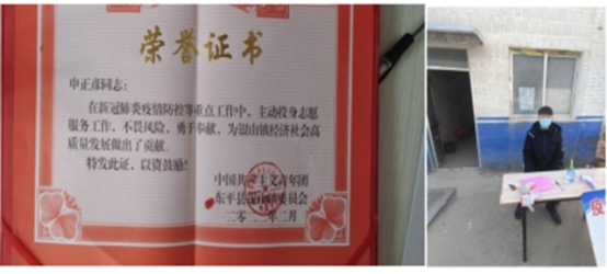 申正彦同学积极完成第四学期志愿活动任务,疫情无情人有情,积极响应地方号召,认真履行疫情防控任务,不怕困难勇敢的站在了疫情防控第一线。
