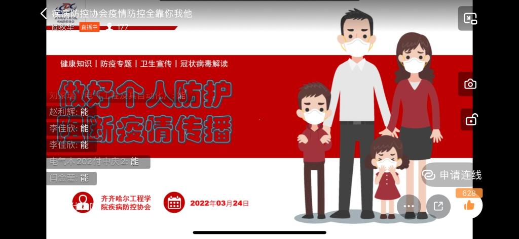 一场突如其来的没有硝烟的战争席卷而来,全国各地都笼罩在新型冠状病毒的阴影中。国难当前,我们的医护工作者,勇往直前,肩负起拯救国家和人民于危难中的重任。与此同时社会各行各业也各司其职,不畏艰难困苦,为打赢这场战役而贡献自己的光和热。但是,在新冠肺炎肆虐的日子里,为了使同学们了解新冠疫情的传播方式,防止疫情传播下去,引导同学们正确认识、理性看待、科学应对疫情,激发学生爱国热情,疾病防控协会于2022年3月24日18:00-19:30在线上钉钉群群号:34176420开展“疫情防控,全靠你我他”主题活动。