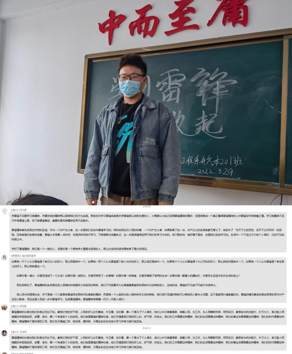 姜宇同学在班级为同学们讲述雷锋同志的光荣事迹,黄敬寒同学通过班级团活QQ群为同学们分享相关资料,同学们将感悟传回QQ群中,并积极讨论。姜宇发言道:“半个多世纪以来,中国社会经历了深刻的经济转型和社会变革,雷锋精神生生不息、焕发着永恒的魅力,激励无数人,在中国大地开花结果、世代相传。”随后,黄敬寒同学在线上提问同学们有关雷锋的小知识,同学们在QQ群内踊跃回答。
