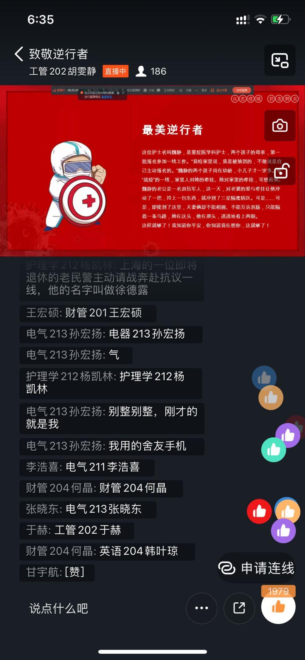 本次活动由活动负责人阎秋华主持,阎秋华告诉我们:疫情就是命令,防控就是责任,这是一场无人能置身事外的挑战和考验,是一场艰苦的战役,每一位某学子都应当尽一份力量,担一份责任,同全国人民一道共克时艰,投入到抗击疫情的战斗中,为打赢这场疫情防控阻击战,作出应有的贡献。尽管这个新型冠状病毒非常可怕,可是一-些医生和护士无所畏惧、逆流而上 ,寻找着解药和救助着病人,他们是最美的人。厚重的防护服,遮住了他们面庞,留给世界的是一一个最美的背影。此次活动负责人通过PPT来让同学们了解在新型冠状病毒的影响下无数白衣战士的出现,并结合视频共同讲解。