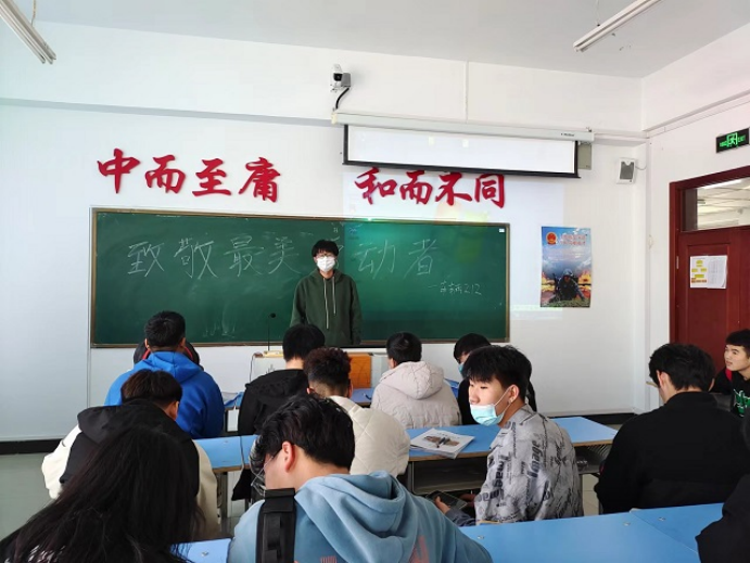 为了弘扬新时代的劳动精神,工匠精神,5月3日早,车辆212班于图书馆429教室开展“致敬最美劳动者”主题团日活动。车辆212班全体学生参加此次活动,活动由团支书霍冬麒主持。