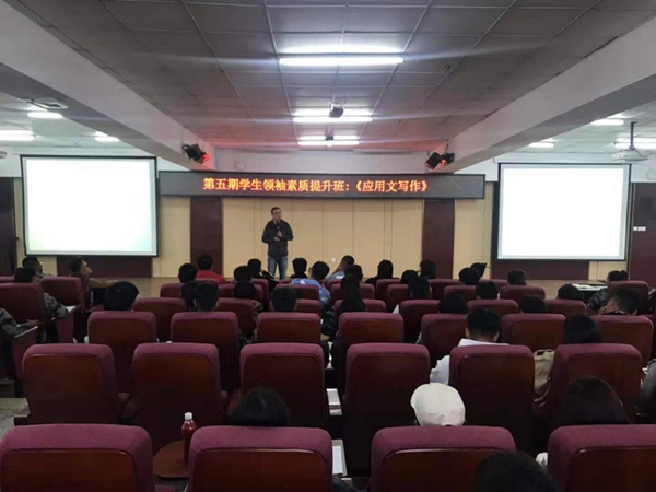 为培养新生高效沟通与语言表达能力,学校于9月18日下午5:30开展了第五期学生领袖素质提升班《应用作文写作》讲座,由郭磊老师为大一的新生讲解。