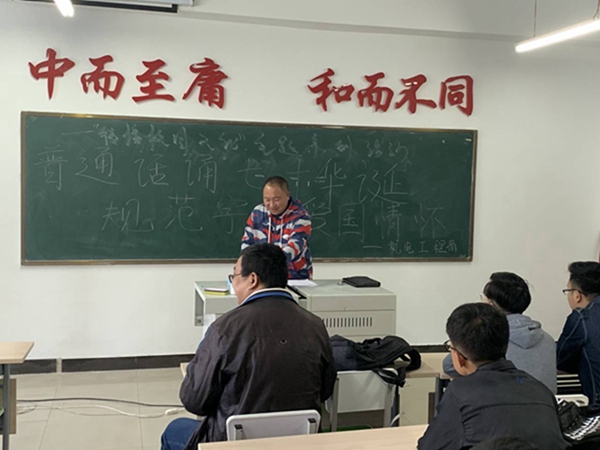 孙晓芳老师说:为了弘扬传承中华优秀语言文化,让“文字活起来”,引领全社会特别是广大青少年写好“方块字”,说好普通话,感悟博大精深的中华文化,我们在此召开电气16级会议,让同学们在学习传承中华优秀传统文化的同时积极学习我院的校园文化,维护校园卫生,维护我院文化建筑,讲礼仪懂礼貌,规范自身。孙老师还部署了建国70年要开展的“普通话诵七十华诞,规范字书爱国情怀”的活动。