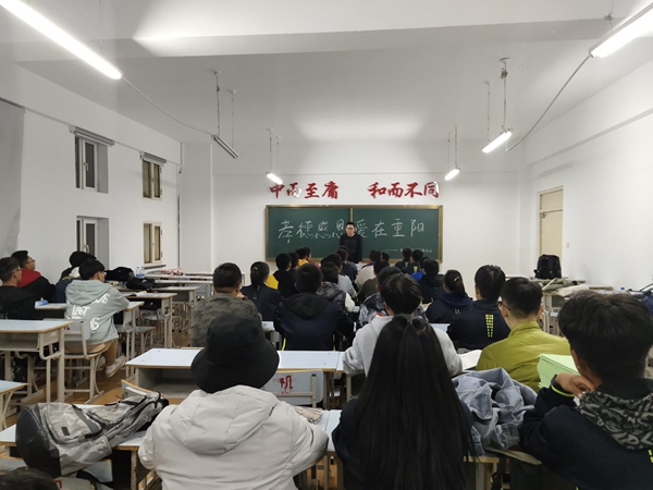 重阳节又称为"双九节"老人节,古人认为是个值得庆贺的吉利日子,并且从很早就开始过此节日。1989年,我国把每年的农历九月九日定为老人节,倡导全社会树立尊老、敬老、爱老、助老的风气,重阳节又多了一层新含意。晚上6:00,同学们准时到达地点,团支书向全班同学介绍重阳节的起源和发展,其中包括重阳节的习俗和特色。随后,文艺委员组织重阳经典诗文朗诵活动,同学们积极响应,诗文朗诵将同学们带进另一种氛围。最后,宣传委员倡导同学们通过打电话、发短信等形式,把节日的祝福带回家,鼓励同学们常去老年社区等地方,关心问候孤寡老人,动员老人参加老年人活动中心开展的一系列活动,以满足老年人的文化需求,促进老年人的心理健康。