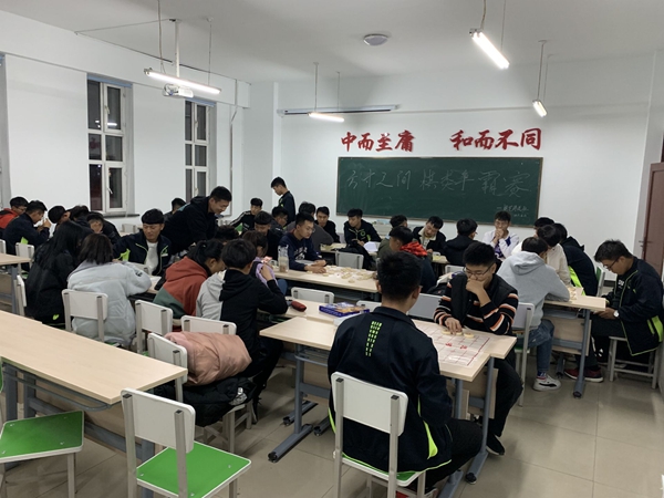 此次比赛设有飞行棋、跳棋、五子棋和象棋、围棋、斗兽棋等比赛。棋弈对阵,智谋比拼,楚河汉界,花落谁家。比赛一开始选手们就投入了这场思维战中,每张桌子都成了战场,你争我夺,一时间棋盘上纵横交错,战火熊熊,选手们你堵我截,或雷厉风行,或精雕细琢,甚是精彩。围观的同学不少,但大家都深谙“观棋不语”的道理,在参赛者旁边站着,保持着安静,共享竞技的快乐。