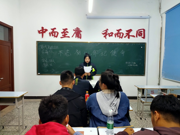 团支书郝建依向同学们阐述了“不忘初心,牢记使命”的内涵为深入学习贯彻习近平总书记新时代中国特色社会主义思想,为人民谋幸福,为中华民族谋复兴,这是我们的初心和使命。初心指中国共产党建党之初为人民服务的初心,使命指中国共产党肩负的实现中华民族伟大复兴的历史使命。作为一名大学生,我们要不忘初心,牢记使命!