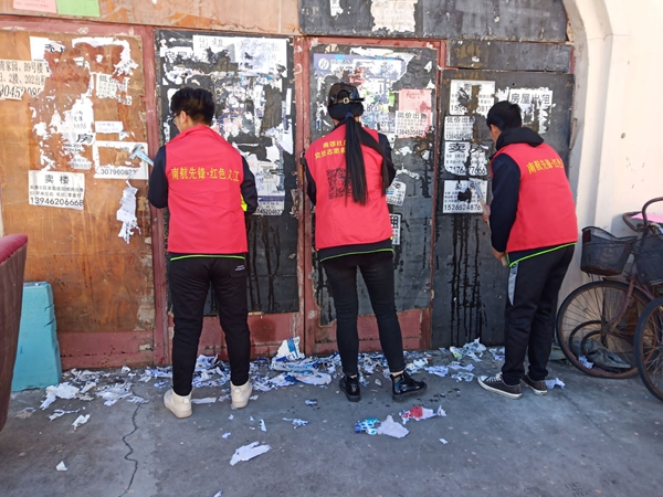 上午9点整,同学们带着打扫工具到达了南郊社区,在南郊社区责任人的带领下领取了工作任务,对墙壁上的小广告清理。刚开始清理这些小广告时显得手忙脚乱,不是清理的不干净就是弄的到处都是,但是经过了清理几次之后,就变得得心应手起来。北方的初冬还是有些寒冷,尤其在外面弄水手很凉,但同学们发扬不怕吃苦,不惧寒冷在精神,圆满的完成了社区交办的此次的南郊社区义务劳动任务