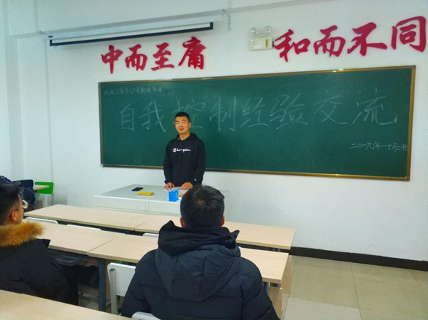 活动开始,三名学长依次上台,分别从:自我控制是什么?为什么要有自我控制能力?该怎样培养自我控制能力?告诉同学们自我控制能力,就是自我行为判断后进行的理性行为,这种理性的判断和执行就构成自我控制能力。这种能力往往就是要实现对很多感性的行为控制,比如遇到事情不分青红皂白就生气,这是失去自我控制力的表现,而拥有自我控制力就是凡事先经大脑分析,作出明确判断之后再进行对现状处理。并告诉同学们这种能力不仅对在我们的生活有益处,对我们学习生活更是有很大的帮助。随后三位学长分享自己的控制经验,与大家共同讨论该如何提升自我控制能力与自己自我控制的方法。
