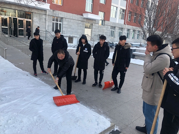 为保持雪后校园整洁,进一步美化校园,11月28日下午,机电系学工副主任孙晓芳带领机械本191、193班干部在图书馆后门西侧进行积雪清扫及定型。