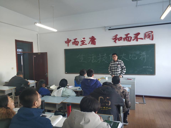 活动以同学讲述自己在生活中具有的生活技能为主,大家相互学习,相互展示。在一位退伍军人的展示下,大家学习到了生活技能的节约,朴实的特点。不仅学到了新的方面的生活技能,还打破常规的固有思想,充分提高了个人的素质,为今后我们所生活的校园环境打下了良好的基础。