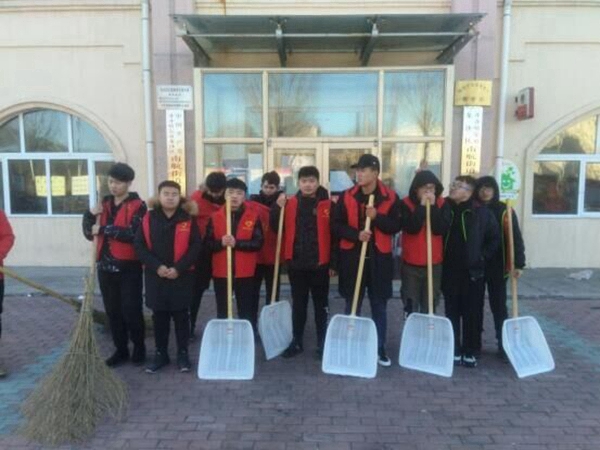 同学们去南郊社区帮助社区打扫门口垃圾和积雪。大家拿着扫把、铁锹等劳动工具,很快投入到了扫雪活动中去。同学们一个个不惧寒冷、争先恐后,经过了两个多小时的努力,社区门口被清理出来了一条宽阔道路。看到打扫干净后的路面,虽然是寒冷的冬季,但同学们的脸上都露出了阳光般灿烂的笑容。