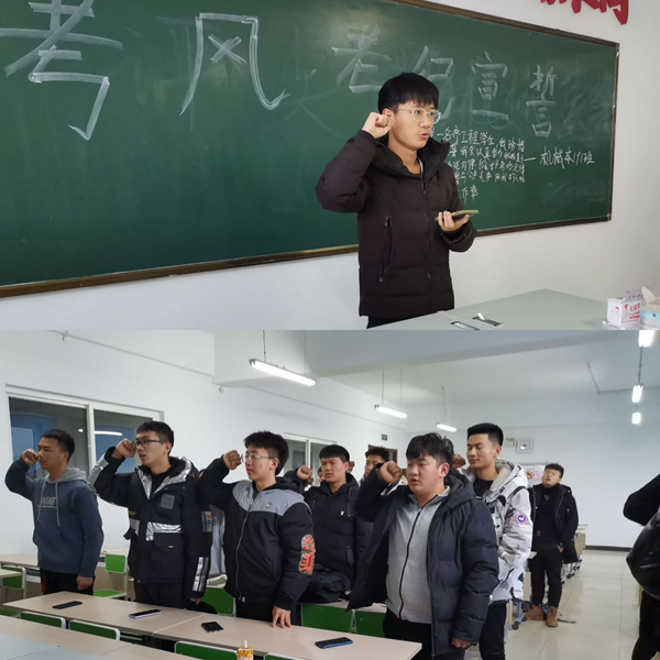 青工委员带领全班同学庄严的举起右手宣誓:我是一名齐工程的学生,我珍惜我的荣誉。我宣誓我会认真努力积极复习迎考;用我的自觉自律,维护考场纪律;用我的自尊自爱,参与公平竞争;用我的人格名誉,拒绝考试作弊。