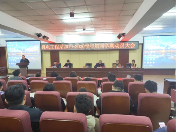 12月25日下午4点10分,机电工程系召开第四学期动员大会,学院副院长张振笋,机电系主任高爱利、副主任黄颖、孙晓芳、所有指导教师和学生参加大会。