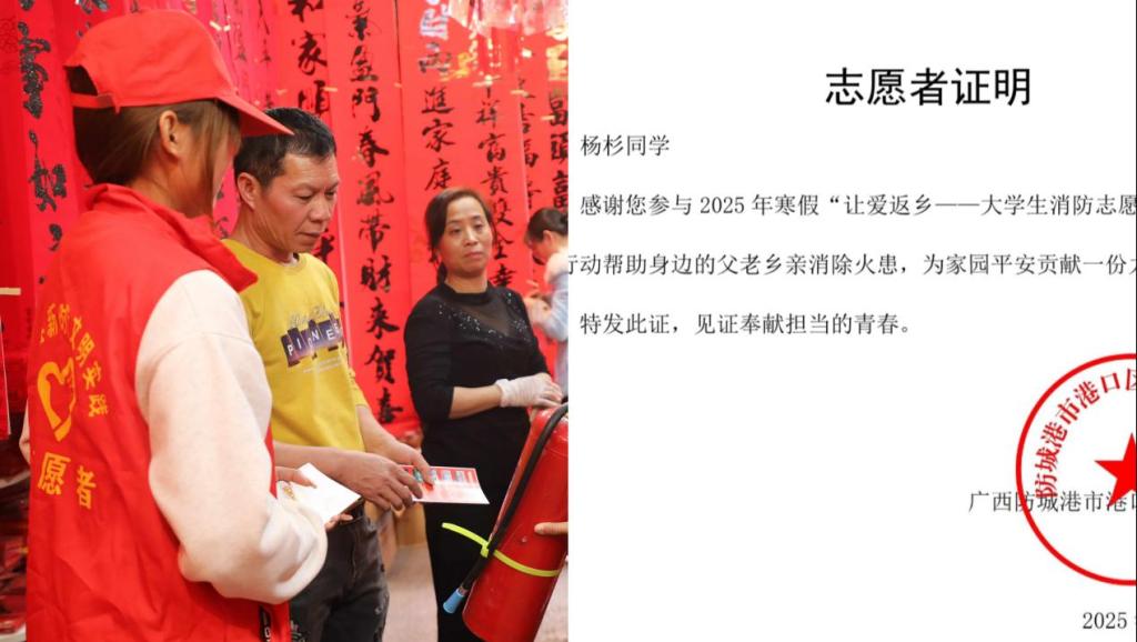 随着社会实践的不断推进,qf2025007组杨杉同学参加了“让爱返乡”为主题的大学生消防志愿服务活动。此次活动旨在向农村居民、城镇居民及社会公众宣传消防安全知识,提升社区消防安全意识。