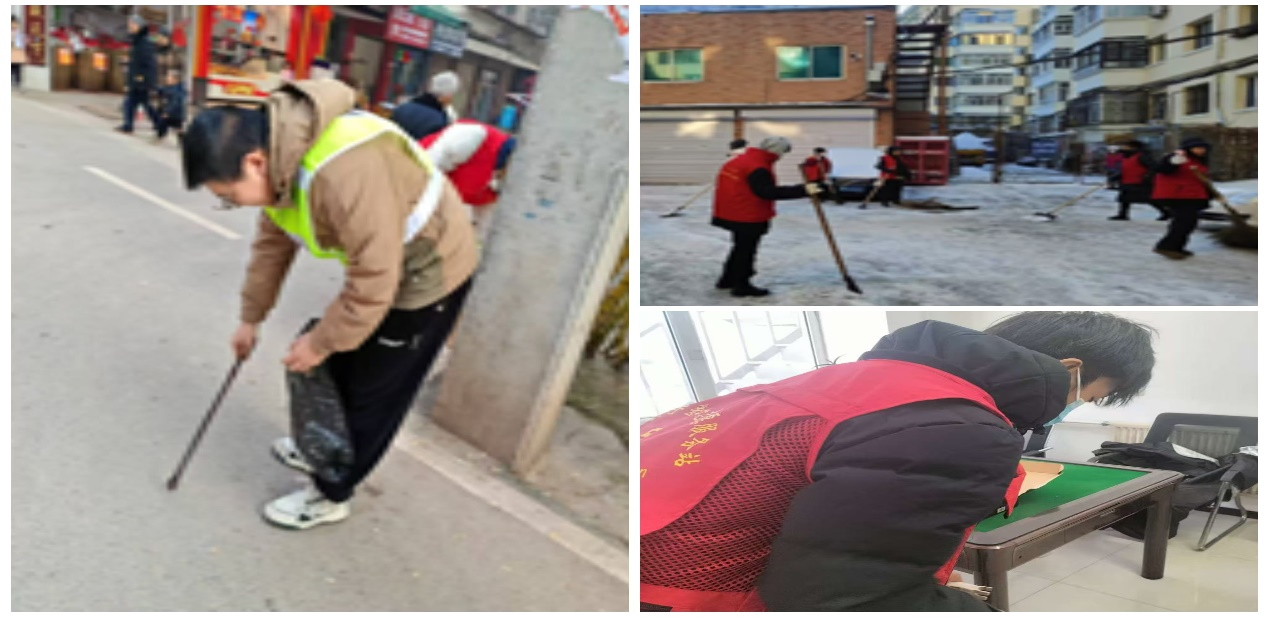 组长洪熙冉在社区帮助行动不便的人维修家庭设备,赢得了居民的连连称赞。组员魏绍琦帮助社区进行出行道路的清雪,防止雪化后结冰,方便居民出行。组员李劲在社区进行街道清扫,帮助清洁工人减轻工作负担,让社区工作者们有更多的时间去帮助他人。