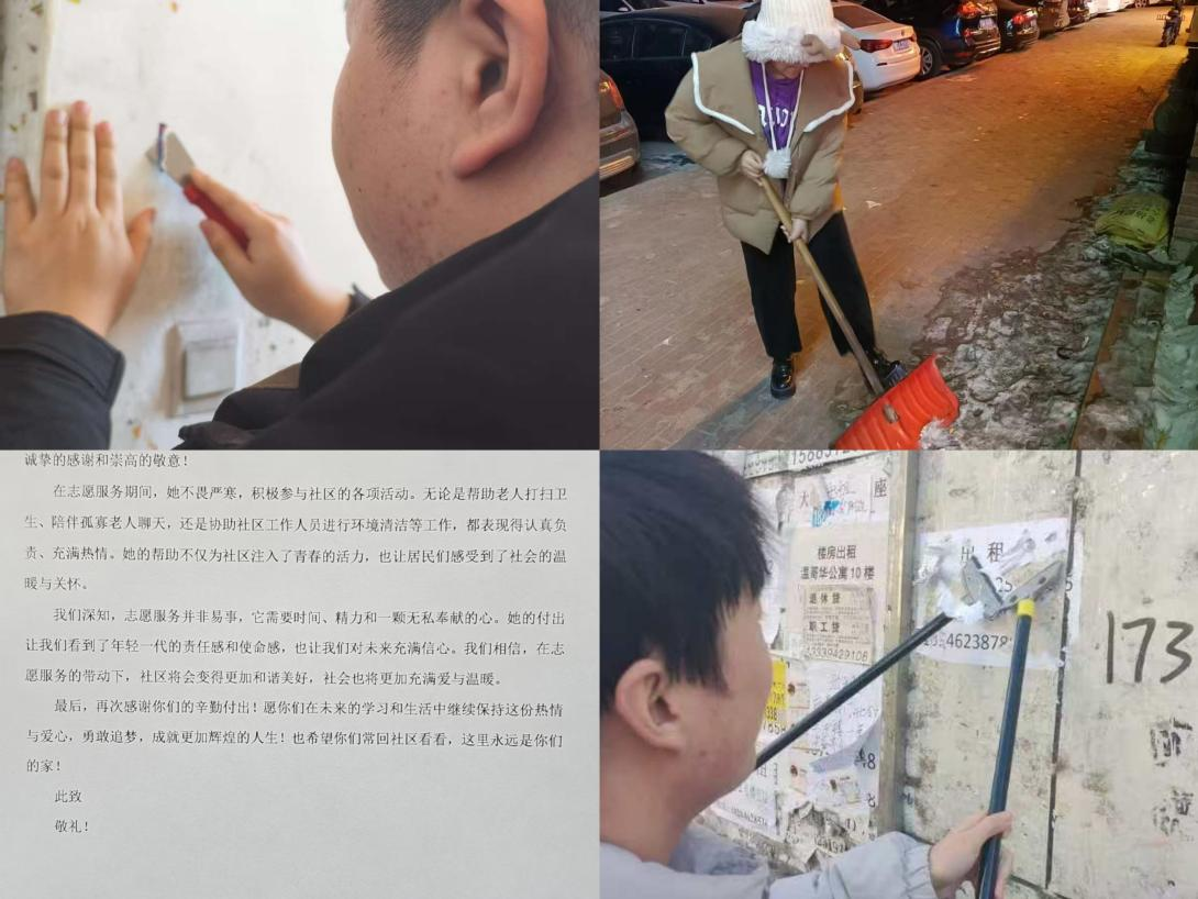 四名同学采用了不同的方式进行志愿服务,展望熟悉的家园,一切都仿佛时空穿梭般回到了曾经,汤博媛同学清理街道积雪,并向居民宣传安全知识,防止积雪滑倒受伤。汤博媛同学的热心和态度得到了社区居民的积极响应和表扬。吕继洋,杨淞淞和朱子彤同学也是分别参与到乡村,社区清洁宣传工作中。大家齐心协力,清理卫生死角,美化公共区域。