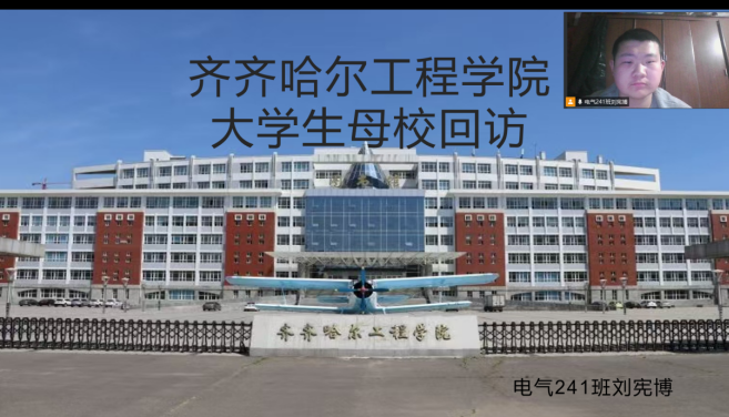 2月25日,刘宪博同学在母校回访的活动中通过线上平台为学弟学妹们分享大学生活并向同学和老师们介绍现在的校园。