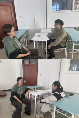 在谈话过程中,李雪东老师针对学生们的不同情况进行了“一对一”交流。对于计划考研的同学,李老师详细了解他们的复习进度,分享了历年考研复试调剂的经验,并提醒大家合理评估自身实力,科学填报志愿。对于准备就业的同学,李老师根据他们的专业特长和职业兴趣,提供了丰富的就业信息,从简历制作、面试技巧到职场礼仪,都进行了细致的讲解。