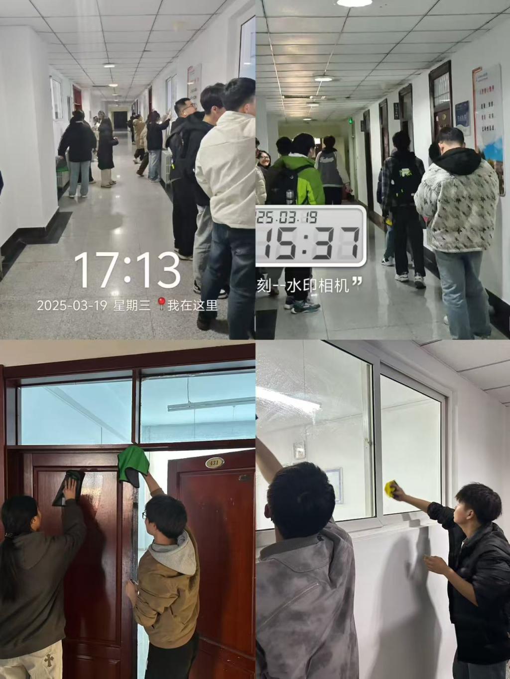 在本次图书馆玻璃清洁活动现场,生活部依据既定方案将志愿者们科学合理地分了多个工作小组。每个小组根据安排,各自承担着不同区域的玻璃清洁任务。各小组之间分工明确且密切配合,形成了高效的工作合力。在整个清洁过程中,志愿者们展现出了高度的责任感和团队协作精神,严格按照清洁标准和流程进行操作,不放过任何一个细微的污渍。经过全体志愿者的不懈努力,图书馆原本沾染灰尘、略显陈旧的玻璃彻底焕然一新。