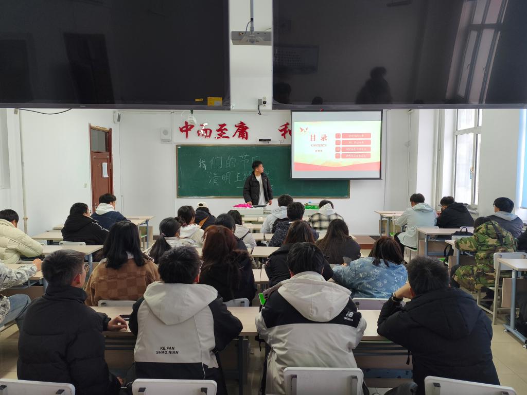 团课上,组织部部长韩梓阳带领大家回顾了清明节的起源与发展,阐述了其蕴含的 “缅怀先人、礼敬祖先” 等文化内涵。随后,通过播放ppt、展示历史图片等方式,呈现了革命先烈们为国家独立、民族解放而英勇斗争的壮丽篇章。