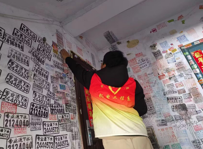 在活动期间,志愿者们身着统一的志愿者服装,手持小铲子、小喷壶等工具,对小区住户门、楼道中墙面上张贴的小广告进行清理。志愿者们展现了高度的责任心,他们充分发扬了不怕苦、不怕累的精神,遇到难清理的小广告,大家就用手一点一点地将小广告铲除掉,确保不留痕迹。