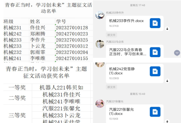 活动以青春奋斗与终身学习为主线,鼓励学生结合个人成长、科技发展、文化传承等视角书写时代担当。参赛作品中,既有对乡村振兴的深情记录,也有对人工智能的理性思考,更不乏对传统技艺焕新的创意构想。评审体系确保公平,多元视角诠释主题深度, 赛事组建由系学生会学习部,采用线上评选机制。评审组组长介绍:"我们重点关注作品是否突破'青春抒情'的浅层表达,在学习观与时代使命的勾连中展现思想锐度。"经过初评(淘汰30%同质化作品)、复评(聚焦主题契合度与文本创新)两轮筛选,最终6篇作品脱颖而出:一等奖1篇,获奖者:机器人221韩贝如;二等奖2篇,获奖者:机械231佟佳兴、机械241李唯维;三等奖3篇,获奖者:汽服221张馨允、机械233卜云龙、机械241孟佳莹。