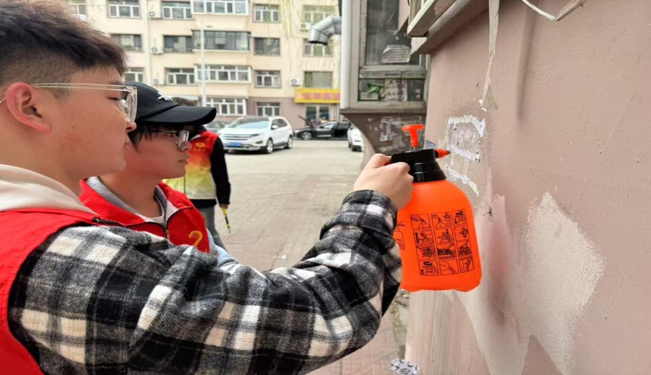 活动现场,志愿者们热情高涨、分工有序,手持喷壶、铲刀、垃圾袋等工具,分工协作,干劲十足。有的志愿者们两两一组,专注地清理着张贴在社区建筑外墙上的小广告。他们手持铲刀等工具,一点一点地铲除那些影响社区美观的“城市牛皮癣”,即便双手被磨得有些发红,也丝毫没有停下手中的动作。还有的志愿者们积极参与社区环境清扫,清扫路面垃圾、整理绿化带杂物,不放过任何一个卫生死角
