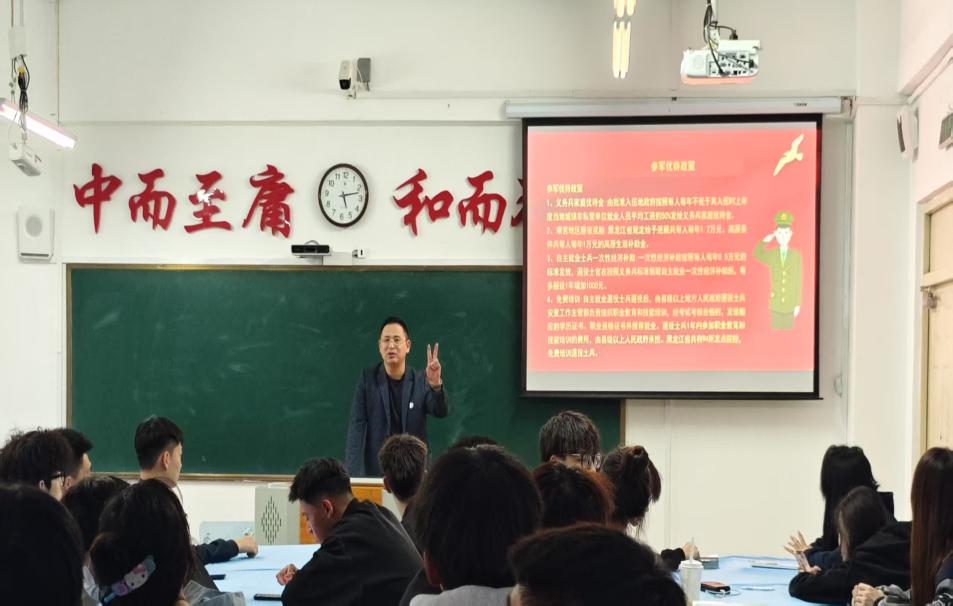 培训过程中,徐飞老师结合最新征兵政策,从多个维度展开深入讲解。他以通俗易懂的语言,系统阐述了参军入伍的各项优待政策,涵盖经济补助、升学保障、就业扶持等内容,帮助学长们全面掌握政策要点。在征兵条件讲解环节,徐老师对照相关法规文件,对政治考核、年龄要求、身体标准等核心要素进行了细致解读,使复杂的政策规定变得清晰明了。培训中,徐老师还特别针对常见疑问进行答疑解惑,进一步加深了学长们对政策的理解。