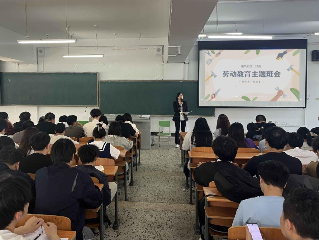 6月6日为深入贯彻落实新时代劳动教育理念,强化学生劳动实践意识,培养知行合一的专业素养,电气专业辅导员陈迎春于图书馆201组织电气22、23级全体学生开展实践学期劳动教育主题班会。