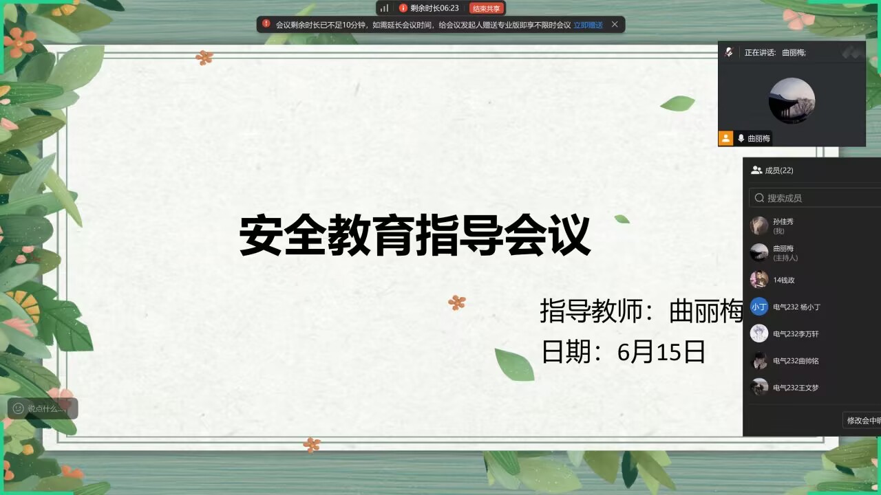 为进一步强化学生安全意识,提升安全风险防范与应急处理能力,电气专业生涯导师曲丽梅于6月15日在腾讯会议上召开安全教育指导线上会议。