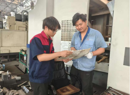 随着实习实践的深入,王春阳逐步开始参与了数控机床的机械加工生产环节。在车间里,他经常和师傅围站机床旁,对着图纸和工艺进行请教。师傅凭实操经验给他讲解正在加工的零件的公差控制、刀具选用,王春阳会结合理论知识尝试优化加工路线,然后和机台师傅研究。面对零件平面度超标难题,他和机台师傅反复调主轴转速、进给量,测冷却液效果,最终把误差控在图纸公差之内,这些实践令王春阳学会将理论融入实践,从“纸面知识”转为“生产力”。