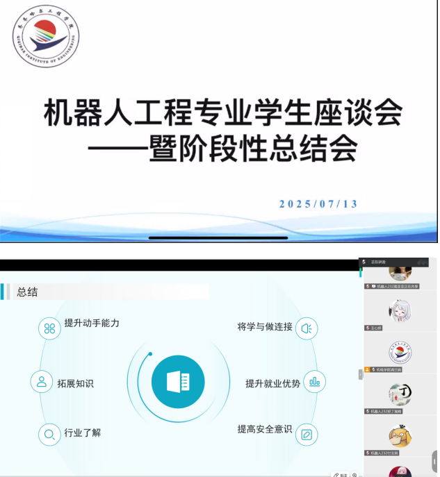 7月13日晚上19点,聚焦实习实践成果与任务部署,机器人工程专业负责人浦兰娟召开“学生座谈会——暨阶段性总结会”,辅导员王虹列席,机器人232班全体学生参会。